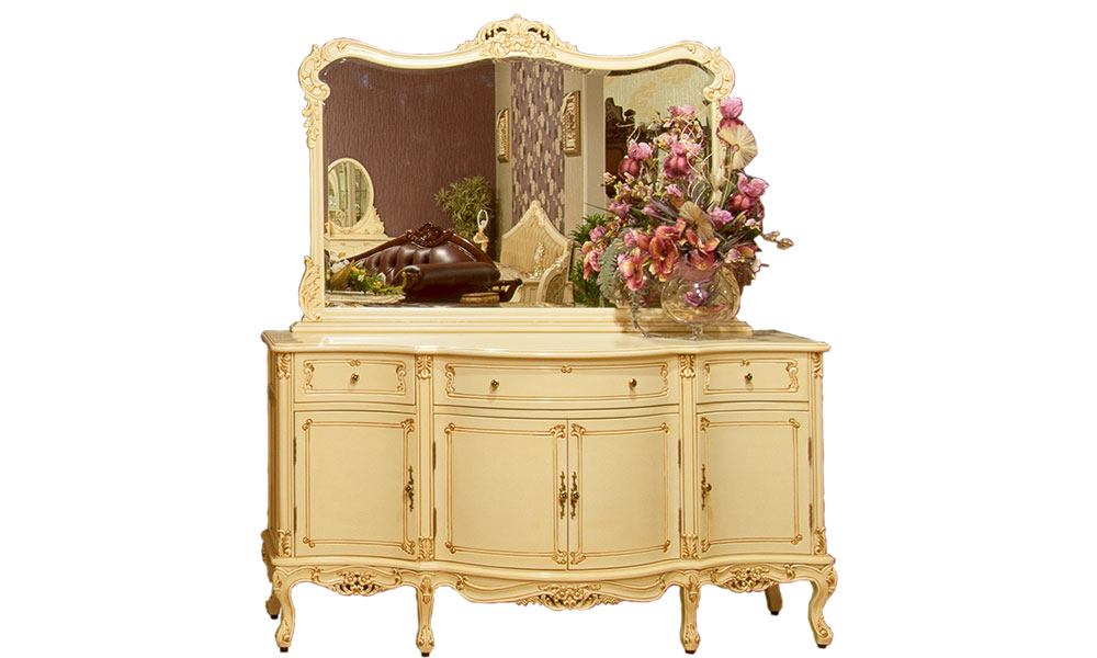 Применение массива красного дерева не вызывает сомнений как в надежности и долговечности конструкции комода, так и в его экологичности и безопасности. Махагон – твердая, мелковолокнистая и в тоже время очень пластичная древесина, что позволяет делать резные детали с очень искусно мелкой резьбой без расслоения и трещин. Махагон – древесина с лоском и красивым фактурным рисунком. Перед использованием в производстве мебели древесина проходит через полный цикл сушки и предварительной обработки антисептиками (для защиты от вредителей) и антипиренами (для устойчивости к воспламенению). Каждой элитной столовой необходим соответствующий комод для хранения необходимых в столовой предметов. Комод CS-16R-5.6M имеет элегантный внешний вид, плавные волнистые линии. Гнутые фасады дверец и выдвижных ящичков комода говорят о высоком технологичном уровне производства данной мебели и по праву относит её к элитному классу. Комод украшен великолепной резьбой. Основание комода имеет декорированную кромку. Стоит комод на плавно изогнутых изысканных устойчивых ножках. Дверцы оснащены красивыми ручками. Комод имеет три легко выдвигающихся вместительных ящика разного размера, а также три дополнительных отделения, закрытые удобными легко открывающимися дверцами. Кроме того, красивой формы столешница комода позволяет расположить дополнительные предметы декора или быта. Настоящим украшением комода CS-16R-5.6M будет зеркало MR16-150. Зеркало имеет красивую форму. Рама зеркала имеет волнистые изящные линии и украшено изысканной резьбой. По всему периметру зеркального полотна произведена фацетная обработка. Гармоничный союз из комода CS-16R-5.6M и зеркала MR16-150 добавят в вашу столовую не только аристократизм и изысканность, но и удобство, комфорт и уют. Купить комод CS-16R-5.6M и зеркало MR16-150 можно в разнообразном цвете: насыщенный красновато-коричневый (GMVD), темно-коричневый (OG), итальянский орех (JWW), слоновая кость с патиной (White Antique), слоновая кость с золотом (WBG), белый с патиной (IVORY), золотой (Gold), серебряный (Silver). Комод CS-16R-5.6M и зеркало MR16-150 станут незаменимыми элементами столовой классического интерьера с соответствующим декором и отделкой помещения в едином стиле, а возможность изготовления в различных цветовых вариантах позволит удовлетворить вкусы и предпочтения в оформлении жилого пространства самых искушенных покупателей. Комод с зеркалом от фабрики MAHOGANY – это та мебель, которая надежно прослужит Вашей семье века и по-прежнему останется в моде.