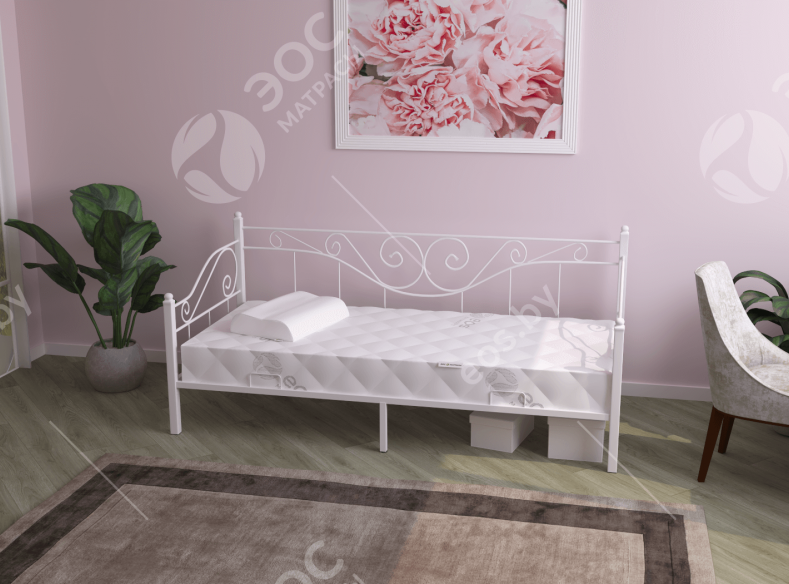 Кровать Эрика имеет форм-фактор тахты и помимо стандартных изножья и изголовья комплектуется изящной спинкой с декоративными завитками. Модель, таким образом, идеально подходит для размещения непосредственно возле стены. Кровать производится со встроенным металлическим основанием с ортопедическими ламелями. К ней отлично подойдет матрас ЭОС Тип 5а