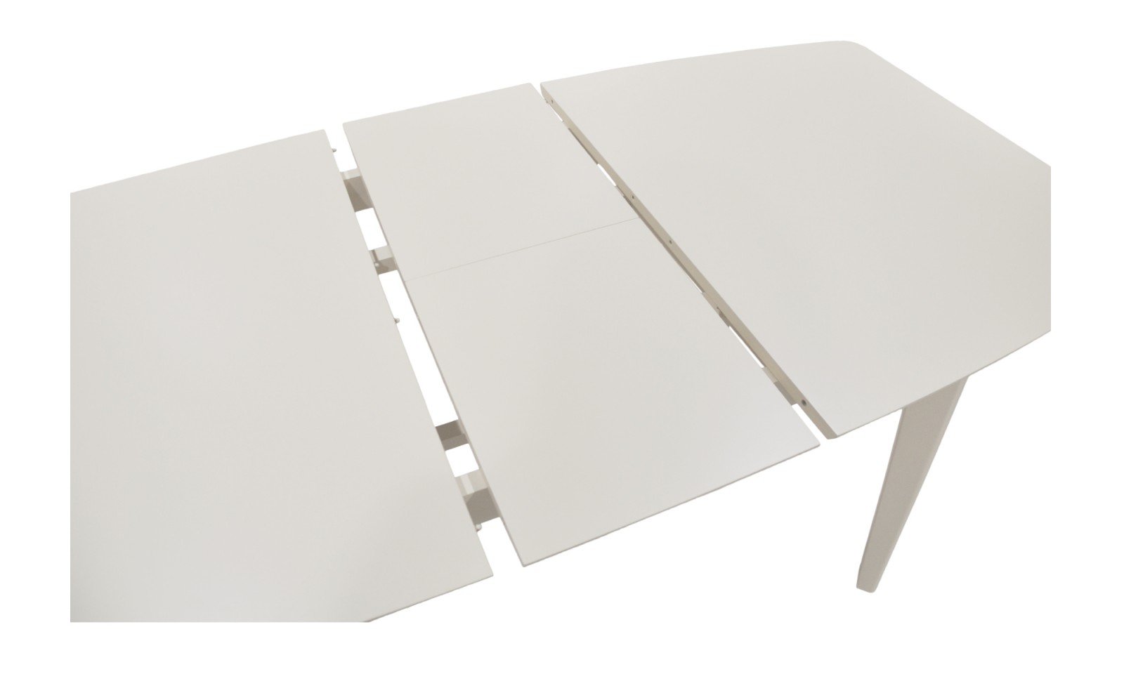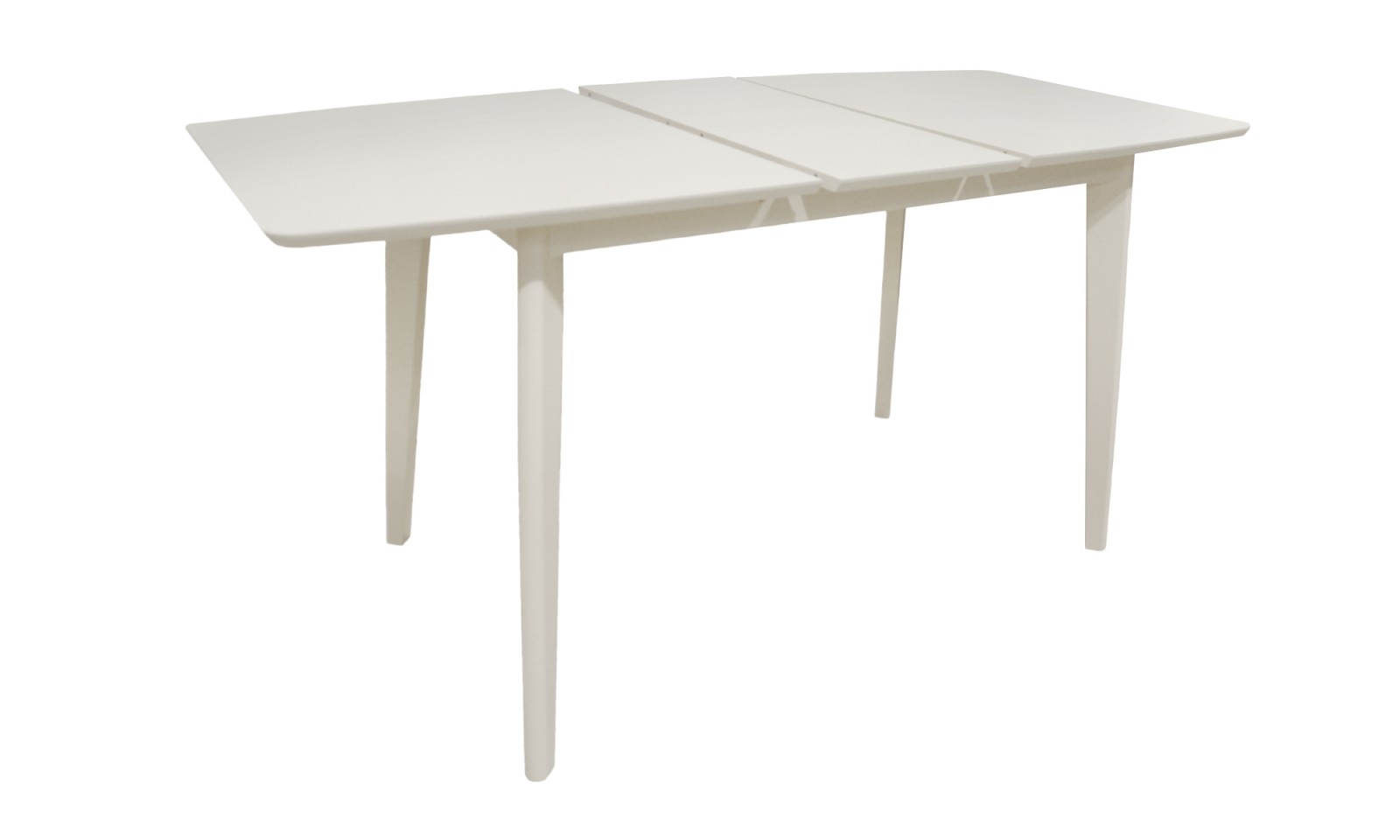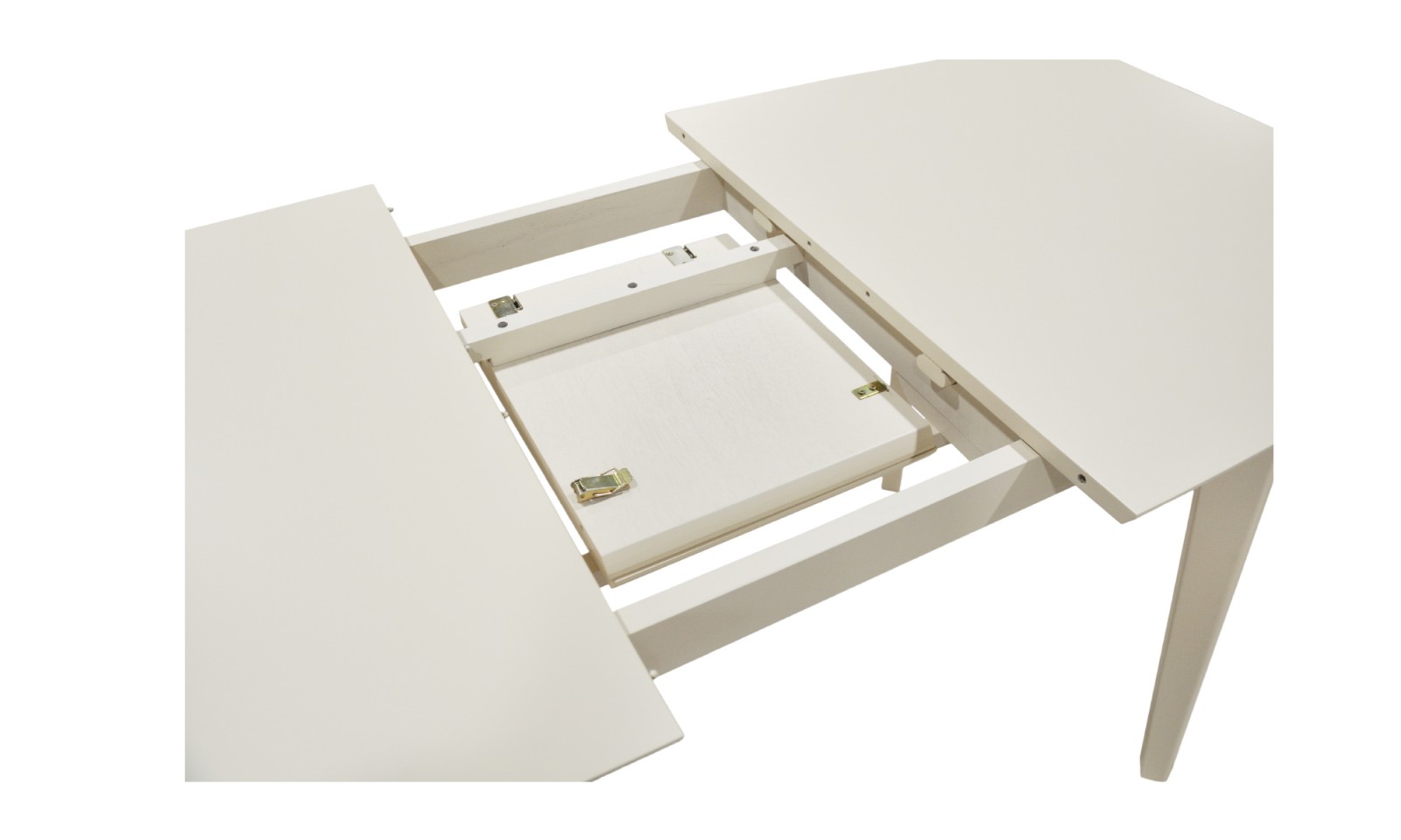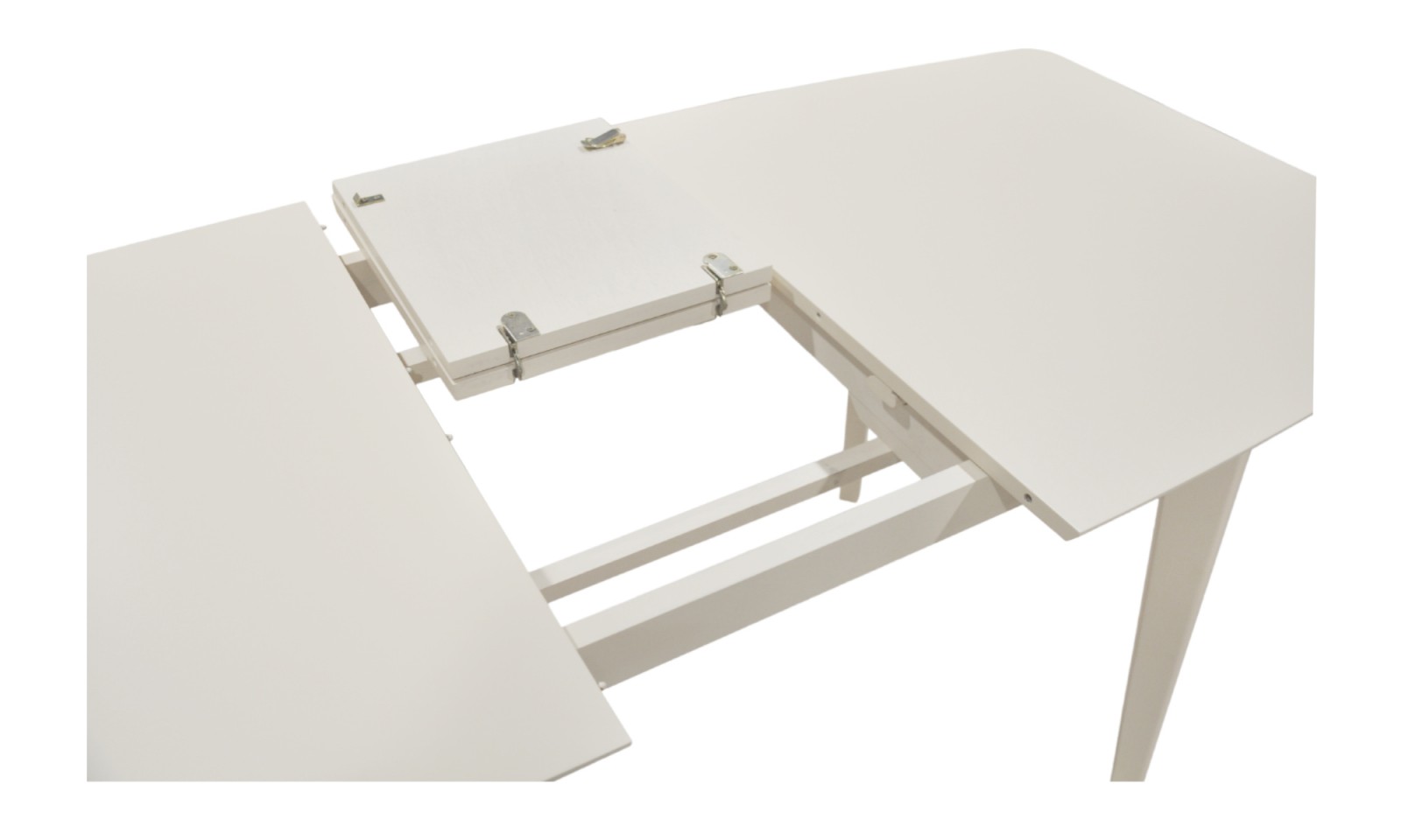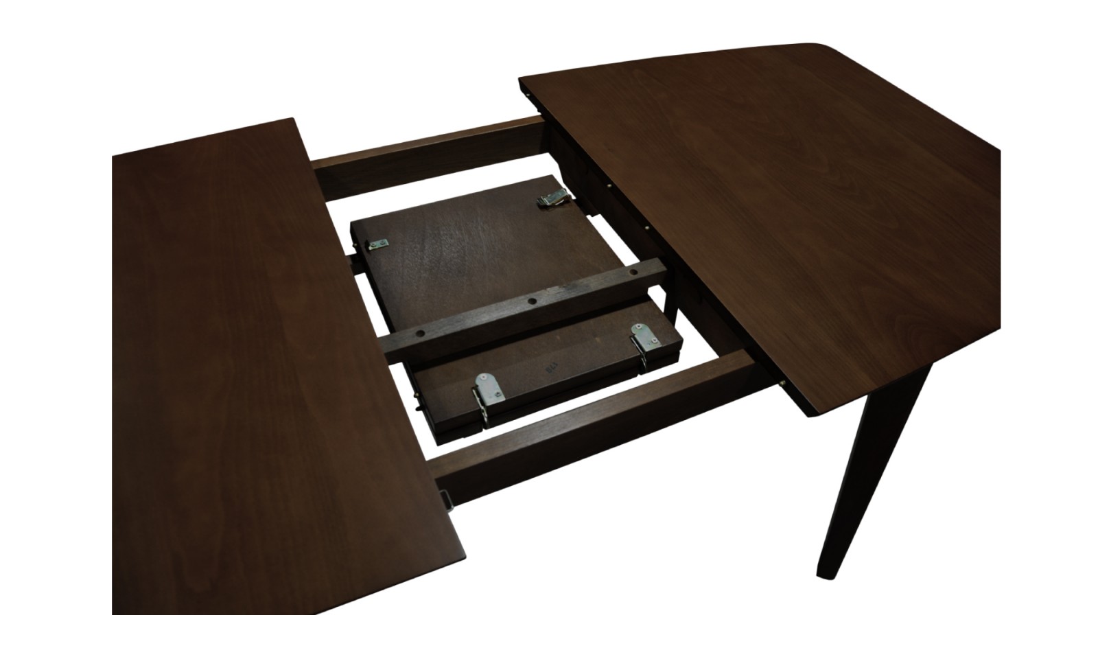 Главное преимущество данной модели — наличие механизма трансформации, который превращает компактное изделие в полноценный обеденный стол. Увеличение рабочей поверхности стола происходит благодаря добавлению дополнительного сегмента, который вставляется в нишу между двумя раздвинутыми половинками столешницы. Добавочная часть находится в специальной нише под основной столешницей, откуда она легко достается в случае необходимости. В разложенном виде он увеличивает свою рабочую поверхность на четверть.